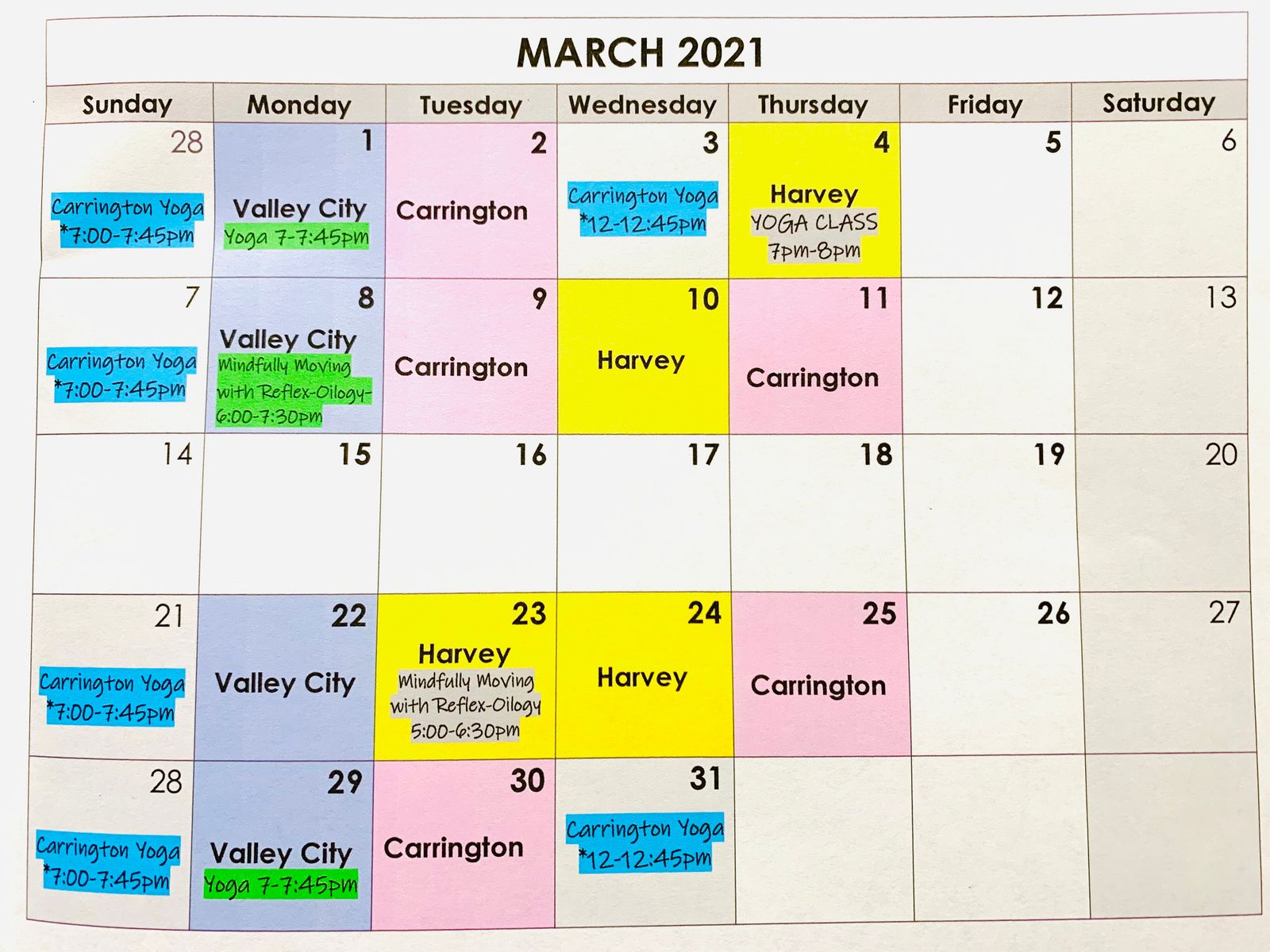 *CARRINGTON- Candlelight Yoga is Sunday's at 7pm (except the 14th) and there will be 2 Noon Yoga classes on Wednesdays. More evening classes will be offered once Lenten Services are done in April.